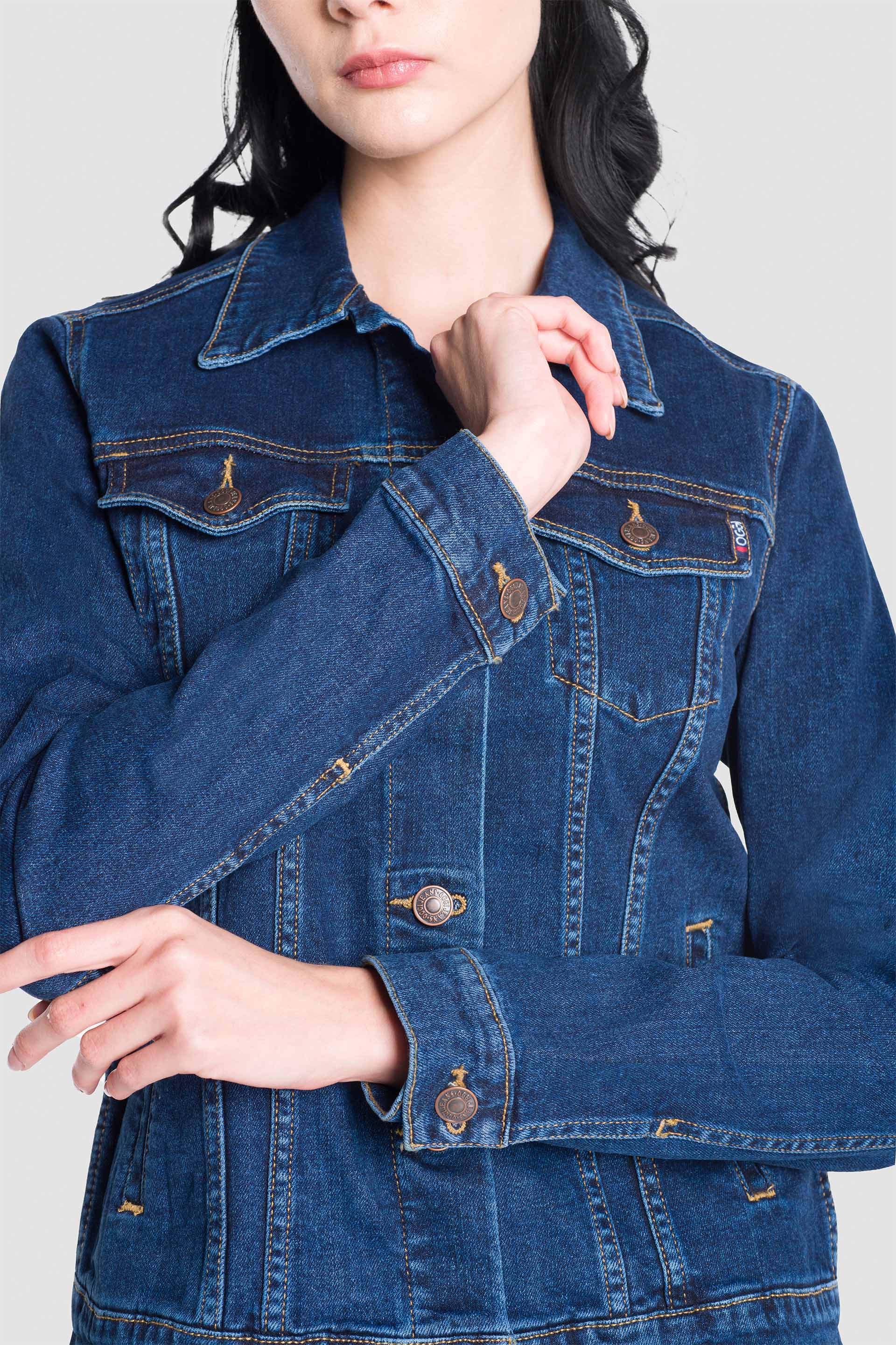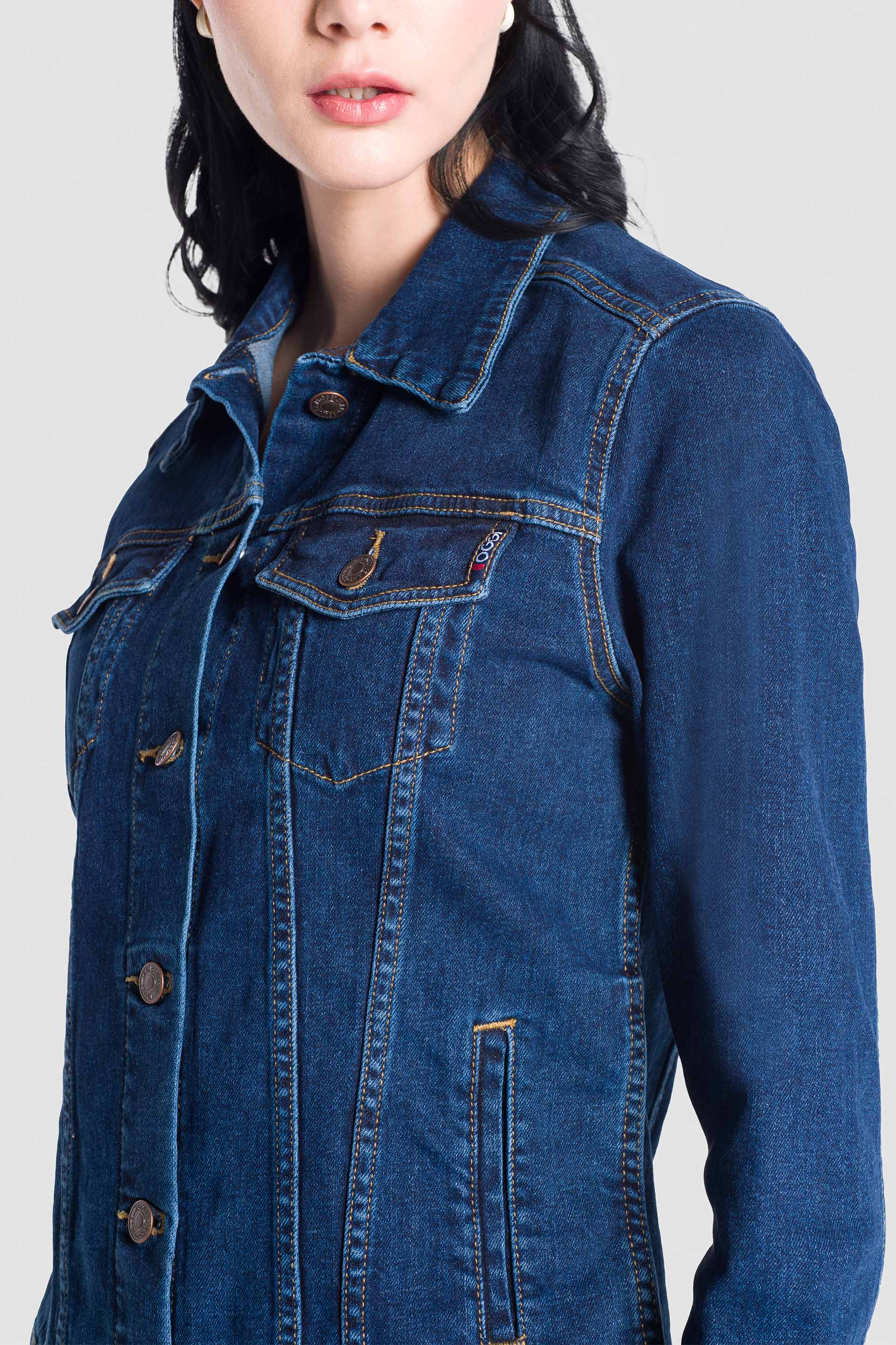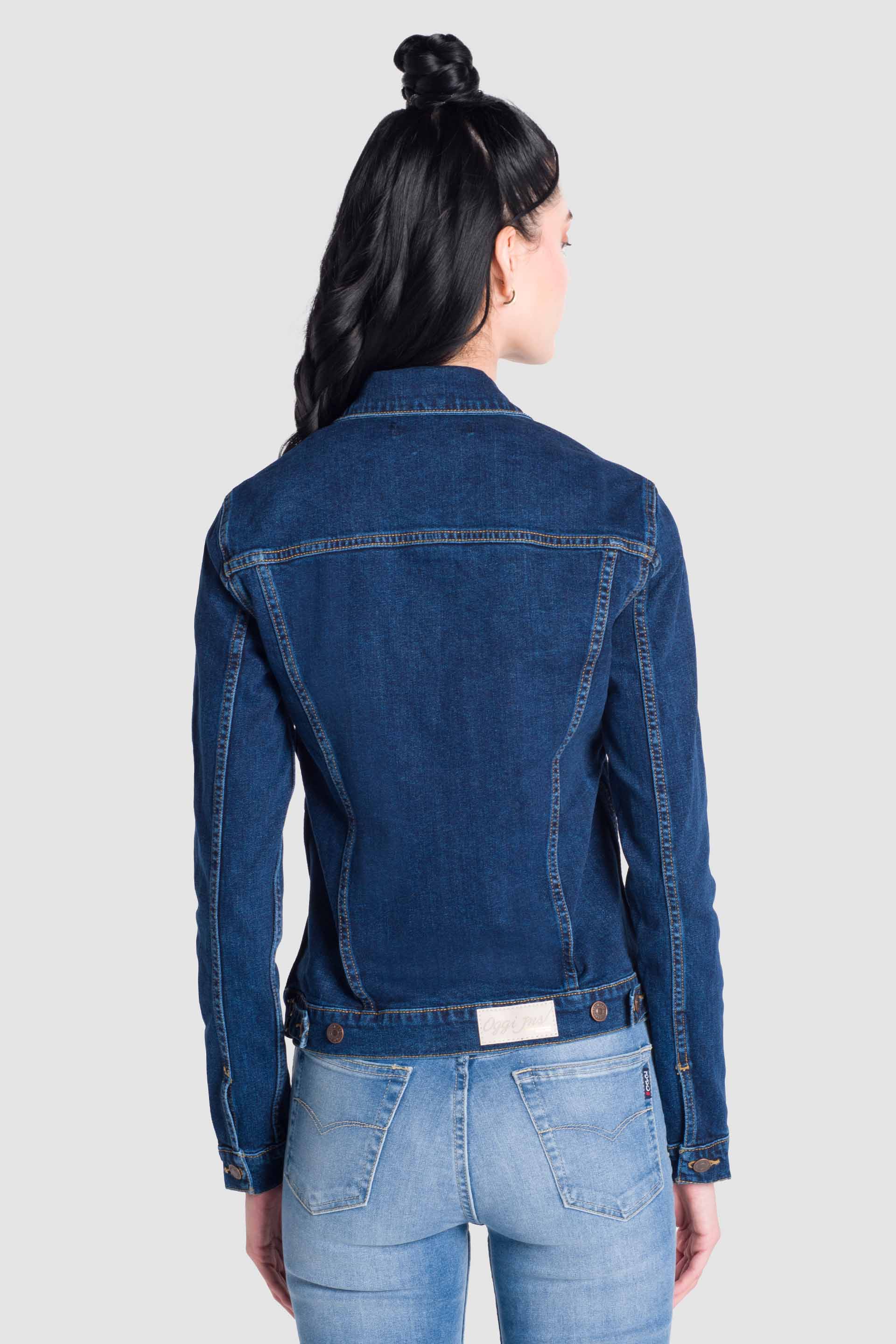 Chamarra Vaquera Slim Fit, botones metálicos, bolsillos diagonales y bolsillos frontales con tapa.