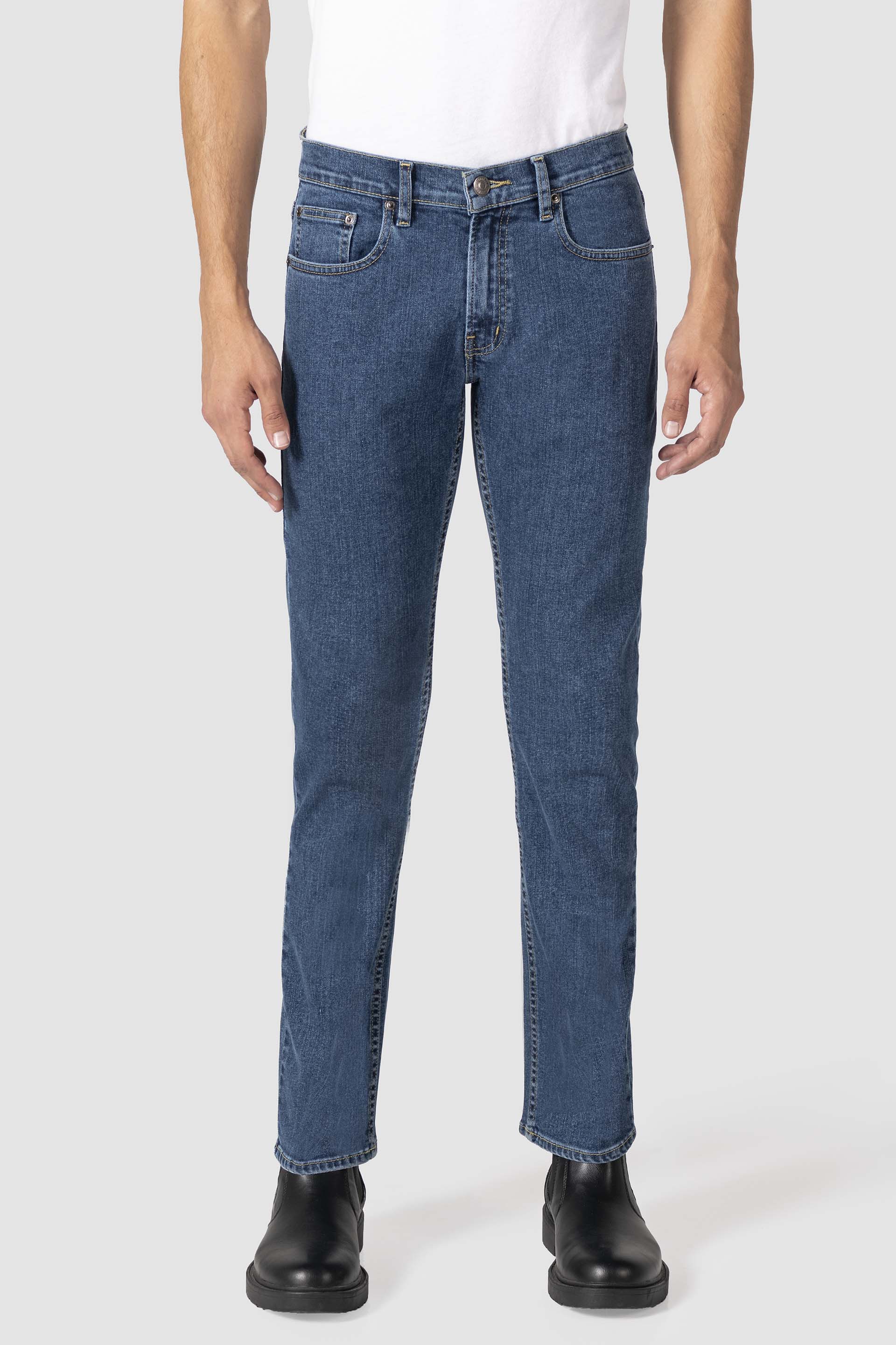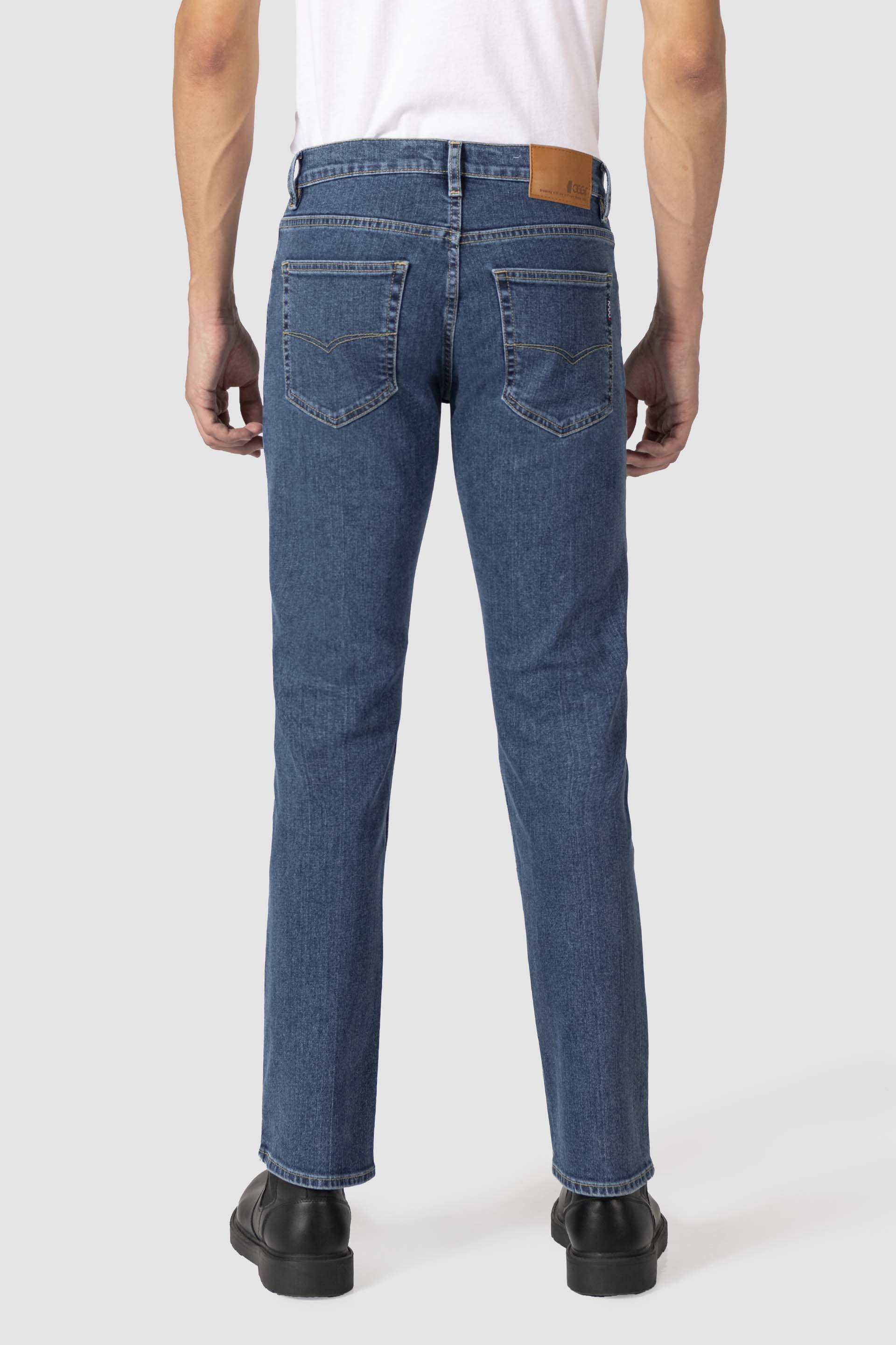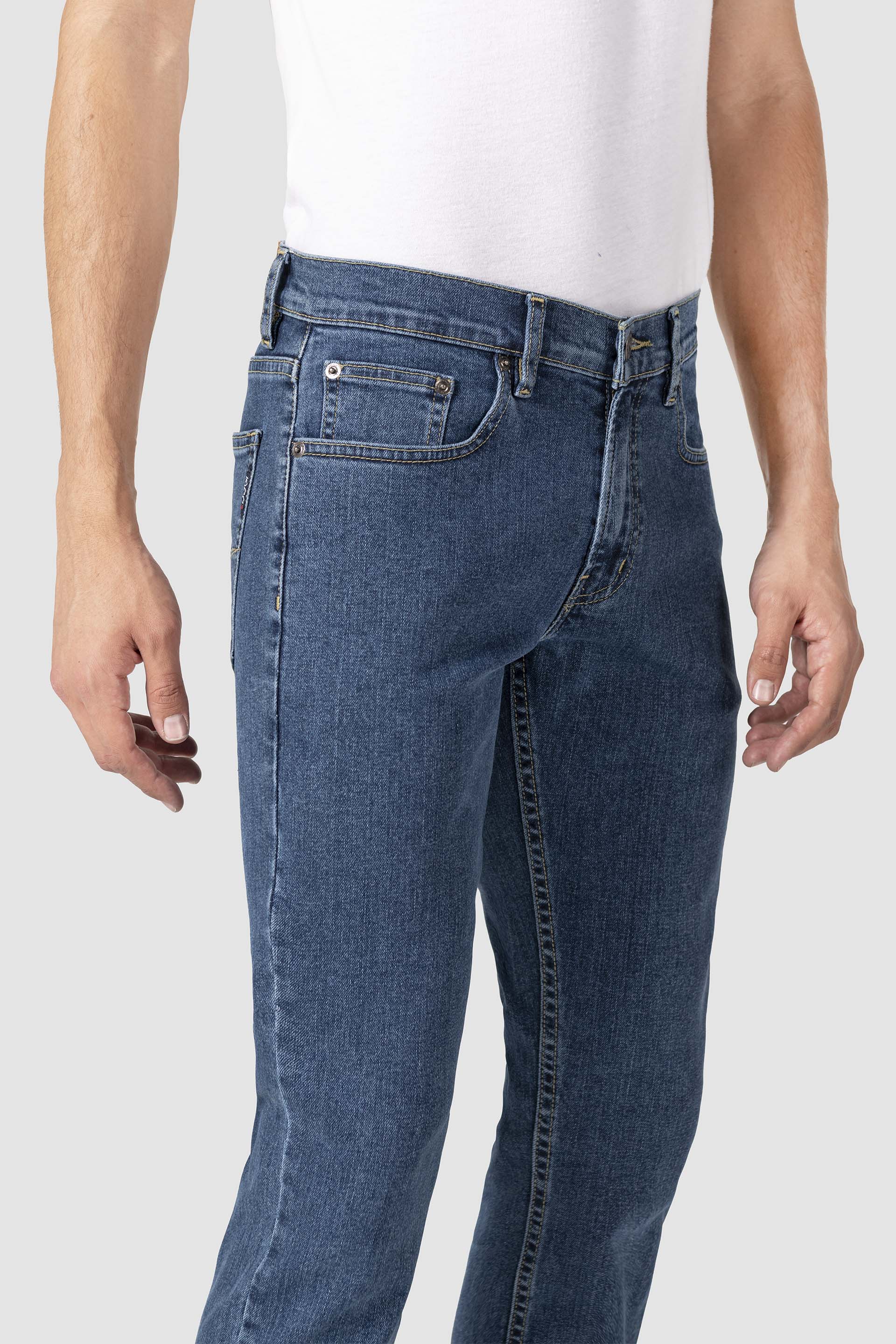 Mezclilla Confort con remaches en bolsillos delanteros, traseros con bordado y etiqueta en pretina sintética. El color puede variar ligeramente por cuestiones de configuración del monitor, brillo y luz.