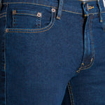 Mezclilla Stretch color Ink, bolsas traseras con bordado, remaches en bolsillos delanteros y etiqueta en pretina sintética.