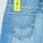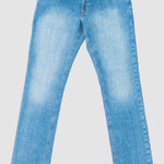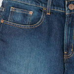 Mezclilla Stretch con proceso Repreve, remaches en bolsillos delanteros, bolsillos traseros con bordado tradicional y etiqueta en pretina sintética.