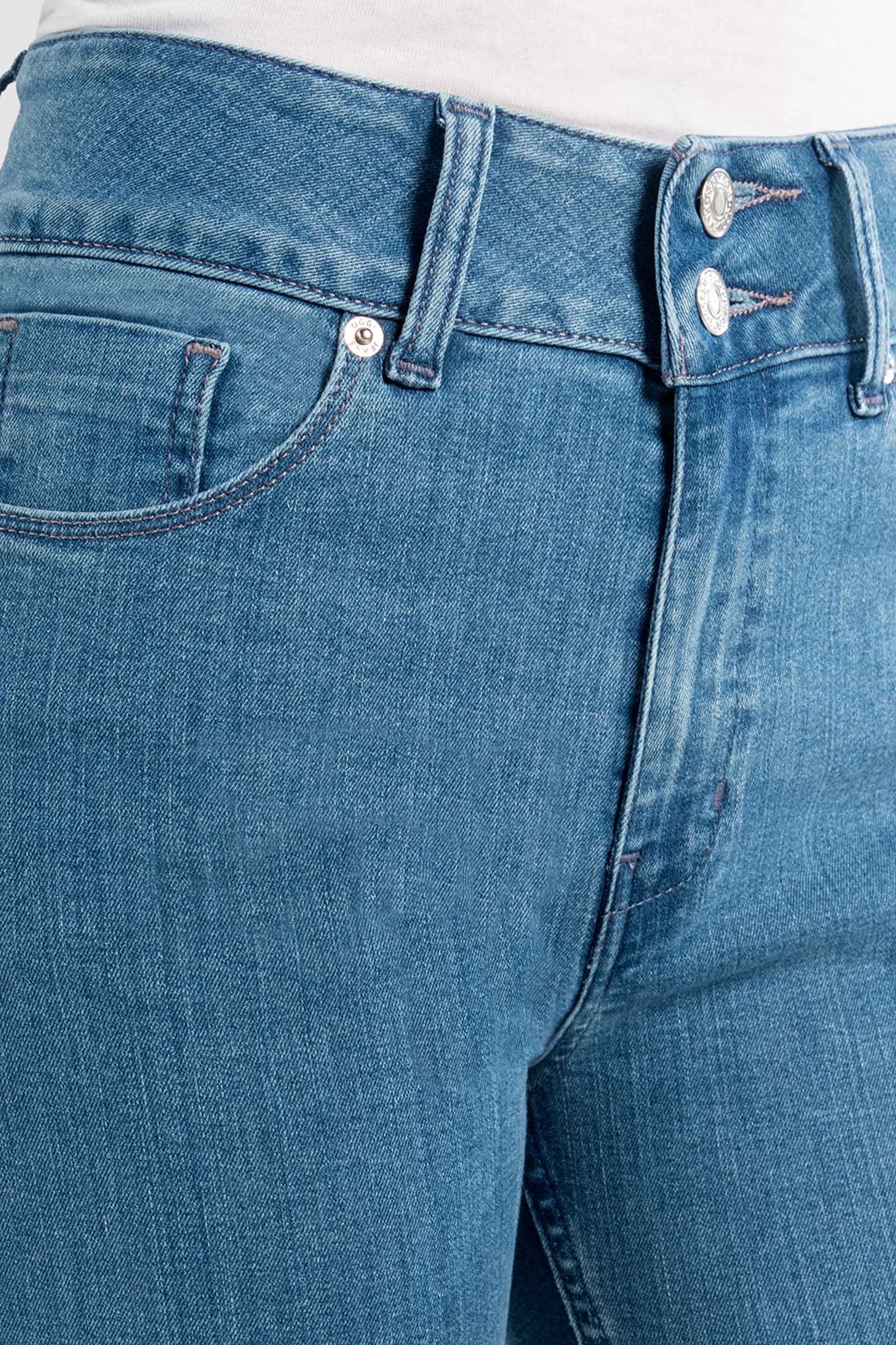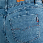 Mezclilla Stretch con proceso Índigo, cierre de doble botón, remaches en bolsillos delanteros, bolsillos traseros con bordado y etiqueta en pretina sintética.