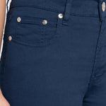 Gabardina Stretch color Marino, hilos al tono de la tela, remaches en bolsas delanteras, bolsas traseras con bordado tradicional y etiqueta en pretina.