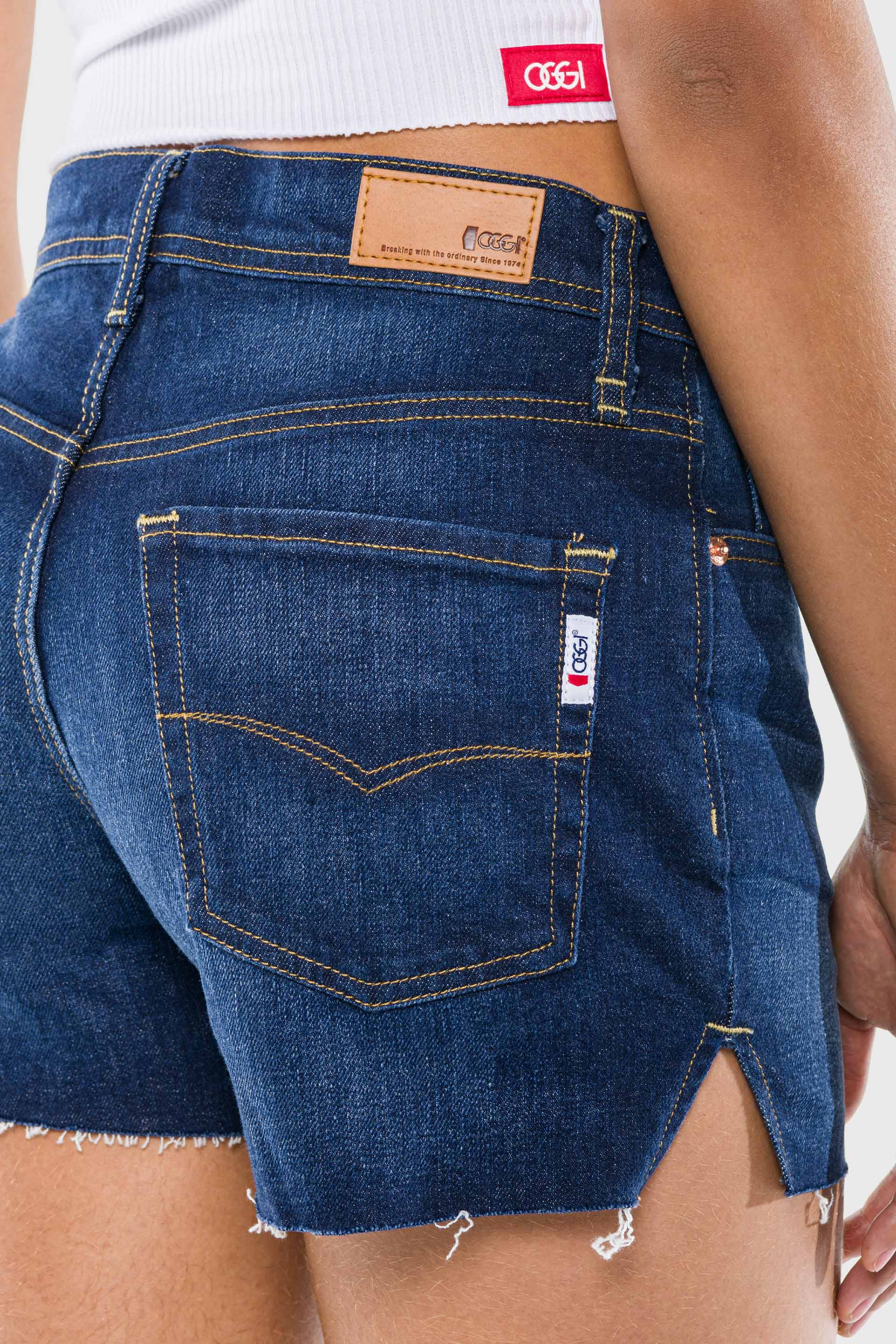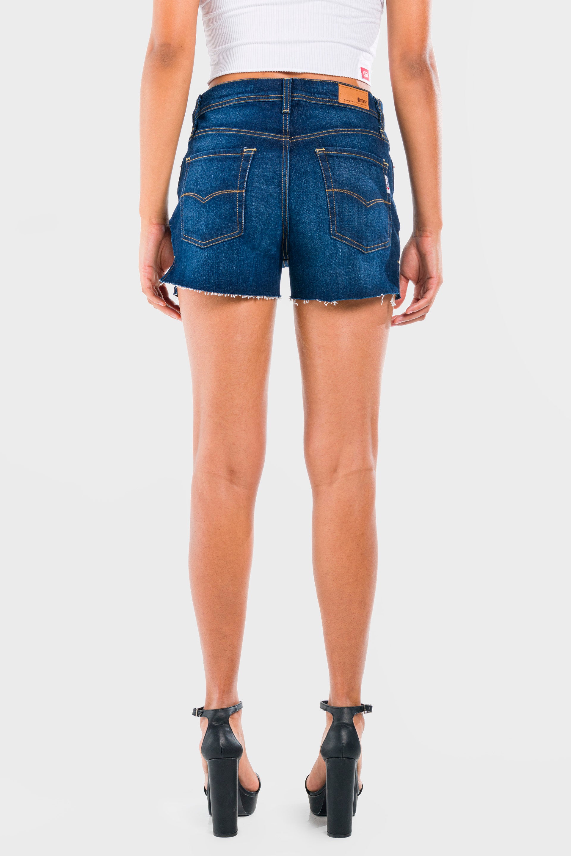 Short Regular Fit de cintura alta, bolsillos delanteros con remaches, traseros bordados, deshilado en bajos, etiqueta en pretina sintética y Whiskers.