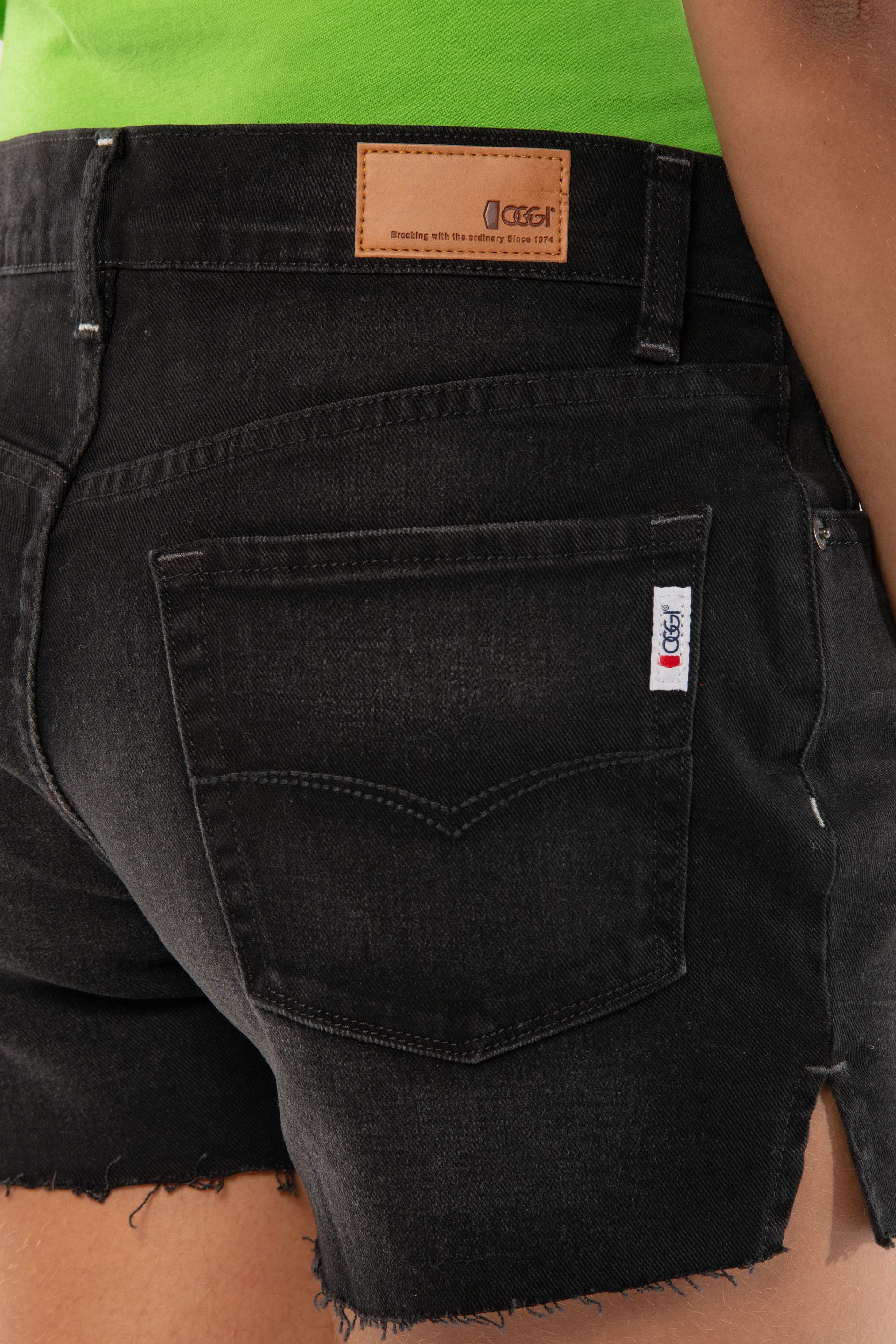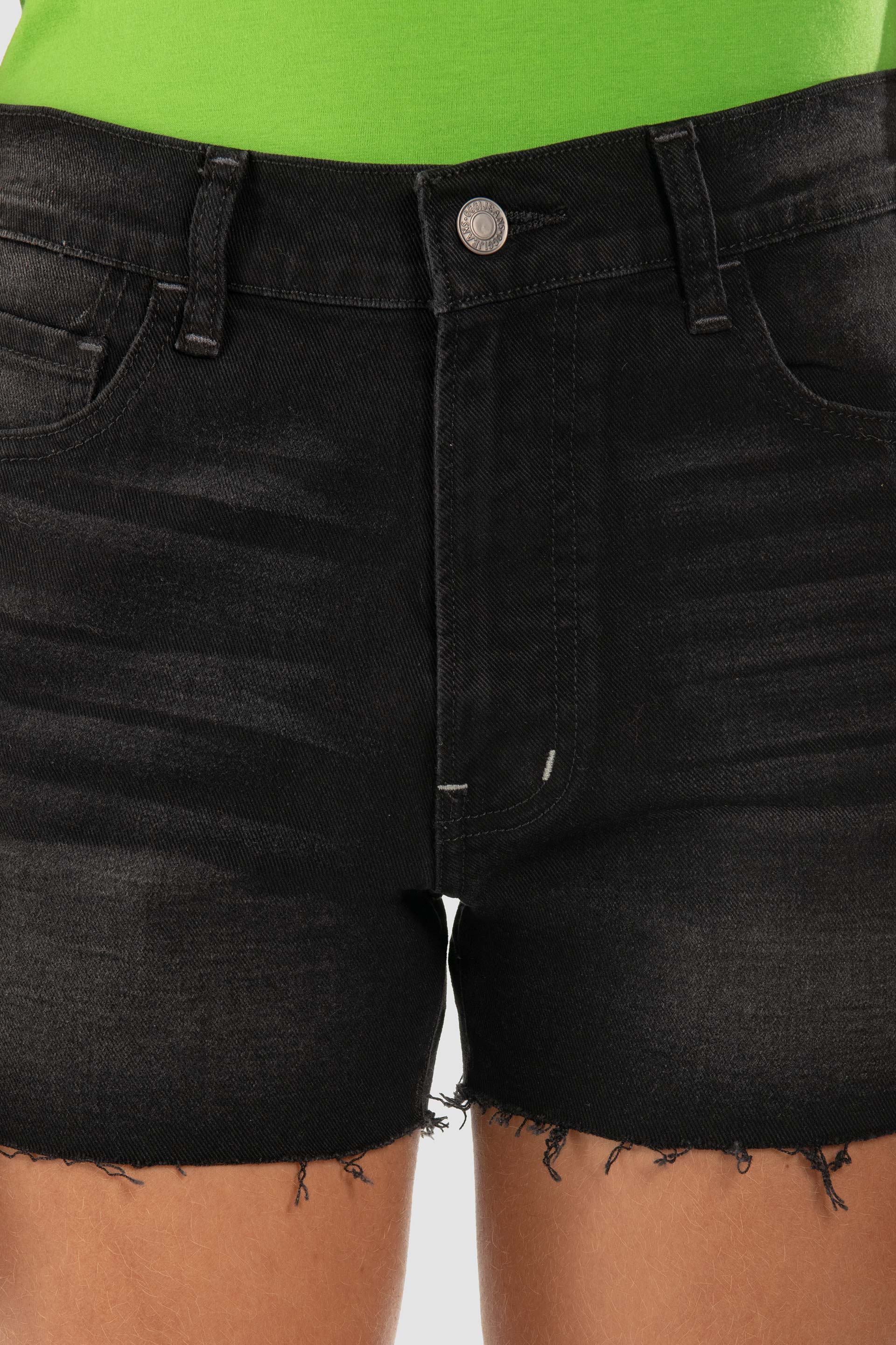 Short Regular Fit de cintura alta, bolsillos delanteros con remaches, traseros bordados, deshilado en bajos, etiqueta en pretina sintética y Whiskers.
